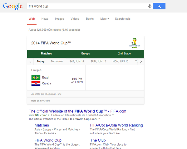Search Google for ‘fifa’ and you get a schedule of matches. Presumably results after the fact. Cool. pic.twitter.com/j5DYdmLtVg