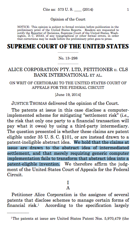 RT @SCOTUSblog: SCOTUS limits software patents in Alice Co but doesn’t eliminate them. Abstract ideas implemented by computer are not enough