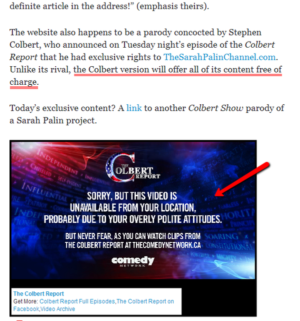 Stephen Colbert Scoops Up Sarah Palin’s Domain j0e.co/1vw Colbert content freely available? Not quite. pic.twitter.com/2eqjgDn9Vf