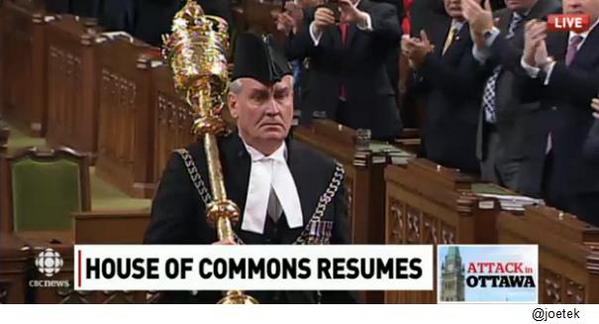 Sgt. At Arms Kevin Michael Vickers leads the re-opening of the House of Commons to loud applause. #hero pic.twitter.com/Lb2iFxJa10
