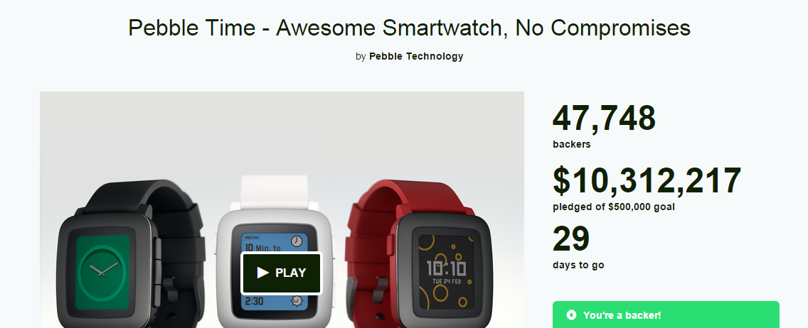 Pebble Time has officially surpassed the original Pebble Kickstarter at $10.3M … In just 48 hours. pic.twitter.com/JqrpVdxGBC