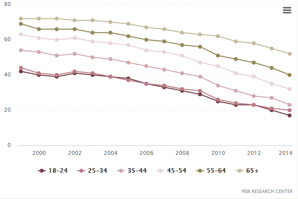 Ouch. Newspaper readership is falling consistently in all age brackets. j0e.co/27d pic.twitter.com/m1DR1Ik1cL