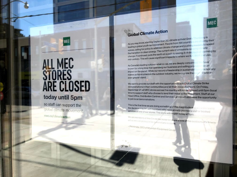 Canada-wide, MEC stores will close on September 27th until 5pm so staff can add their voices to the global climate movement. Read a letter from MEC’s CEO: https://t.co/9jgMLff0rw pic.twitter.com/V8Z0lk75nT