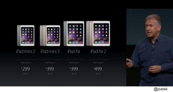 iPad Air 2 starts at $499. iPad mini 3 starts at $399. Pre-orders tomorrow, shipping next week. #AppleEvent pic.twitter.com/TKSzUqM45e